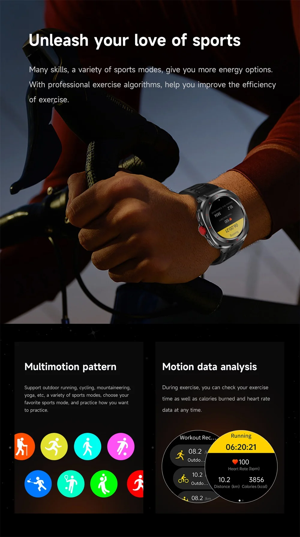 2. Exercise function: Step counting/Calories/Distance, Multiple exercise modes.