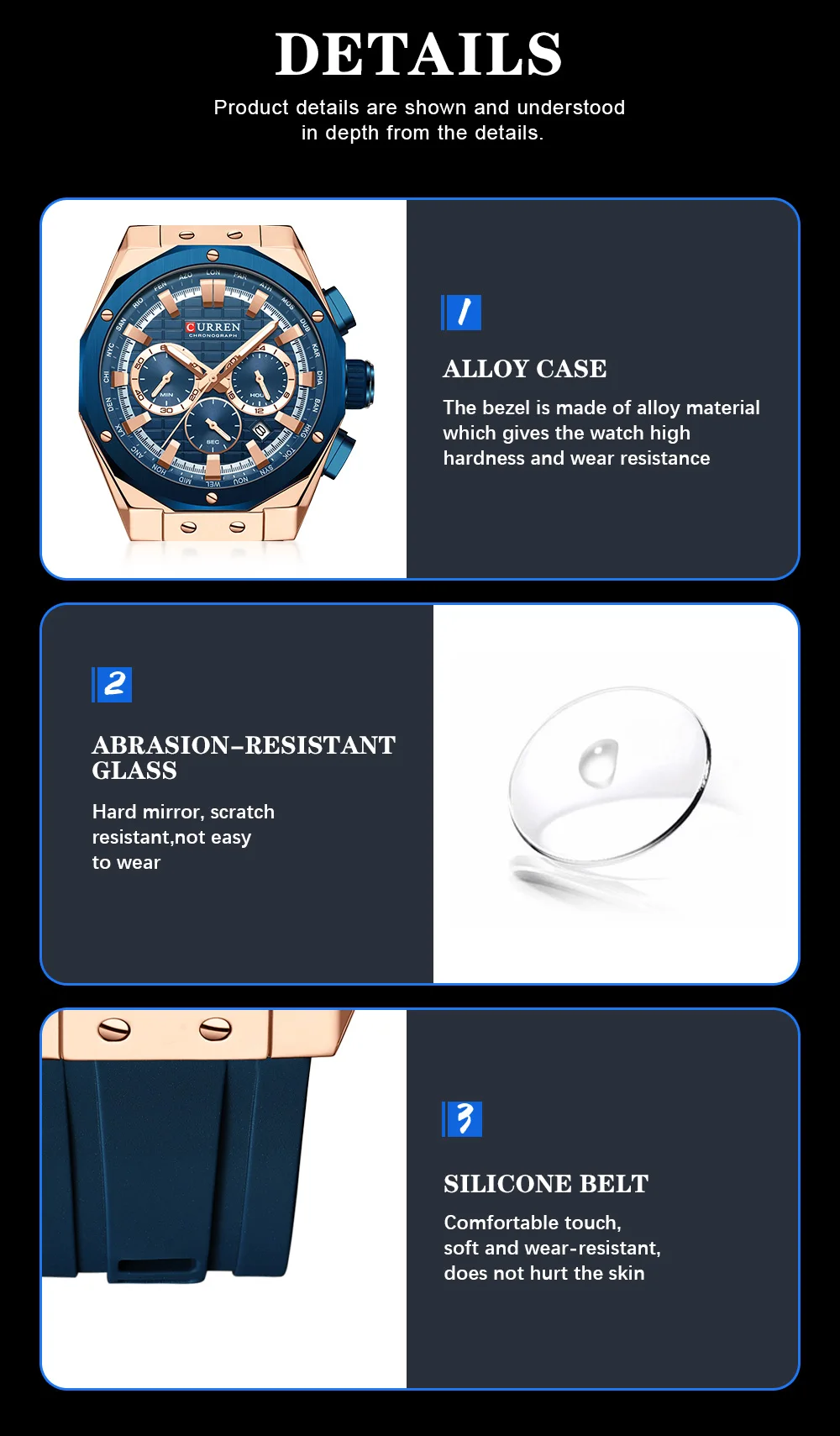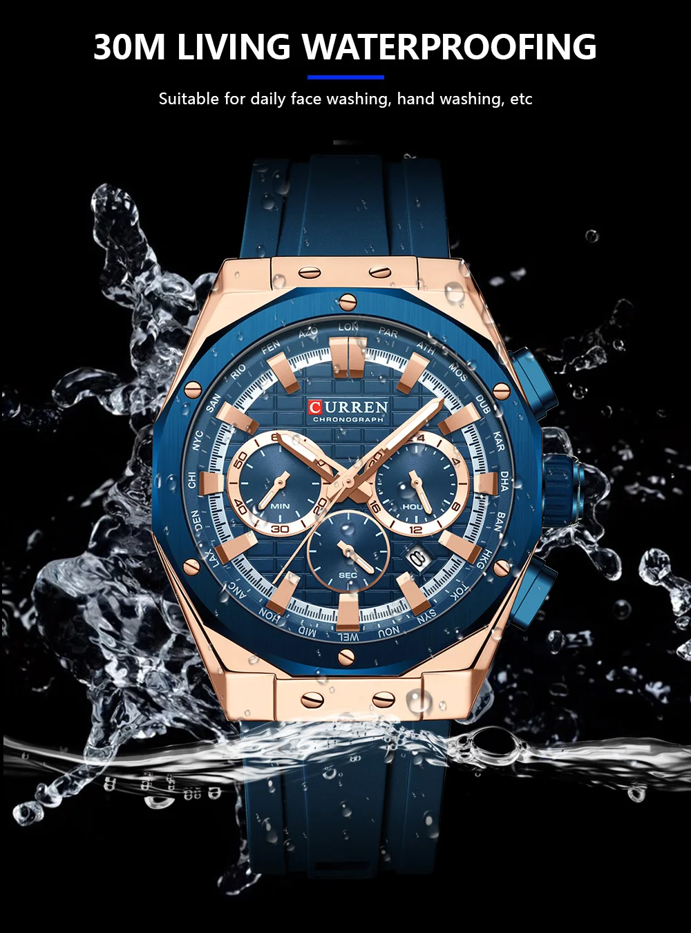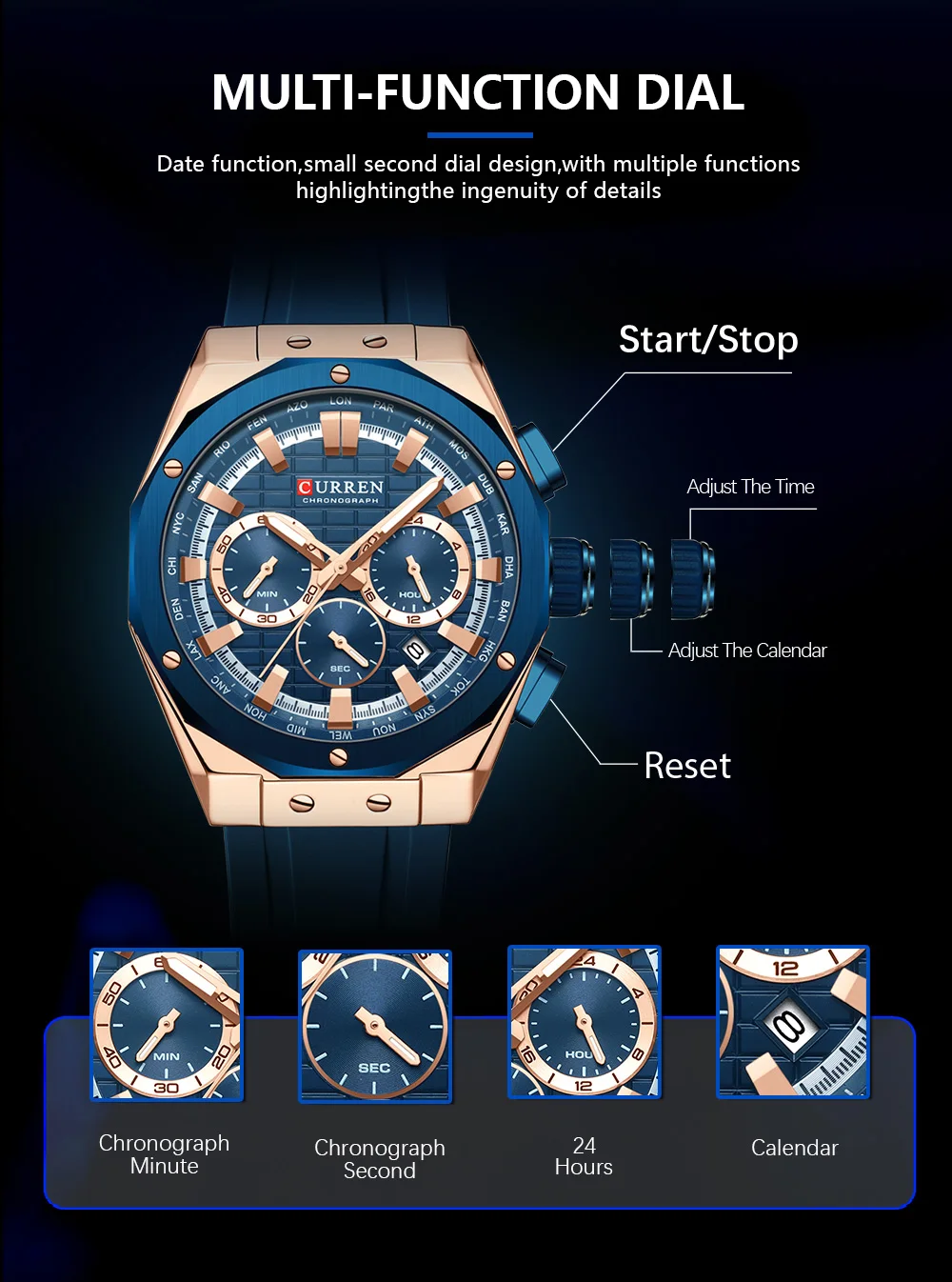 CURREN 8464 Watch for Men 2024 New Multifunctiton Chronograph Men Fashion Blue Silicone Strap Waterproof Calendar Quartz Watches