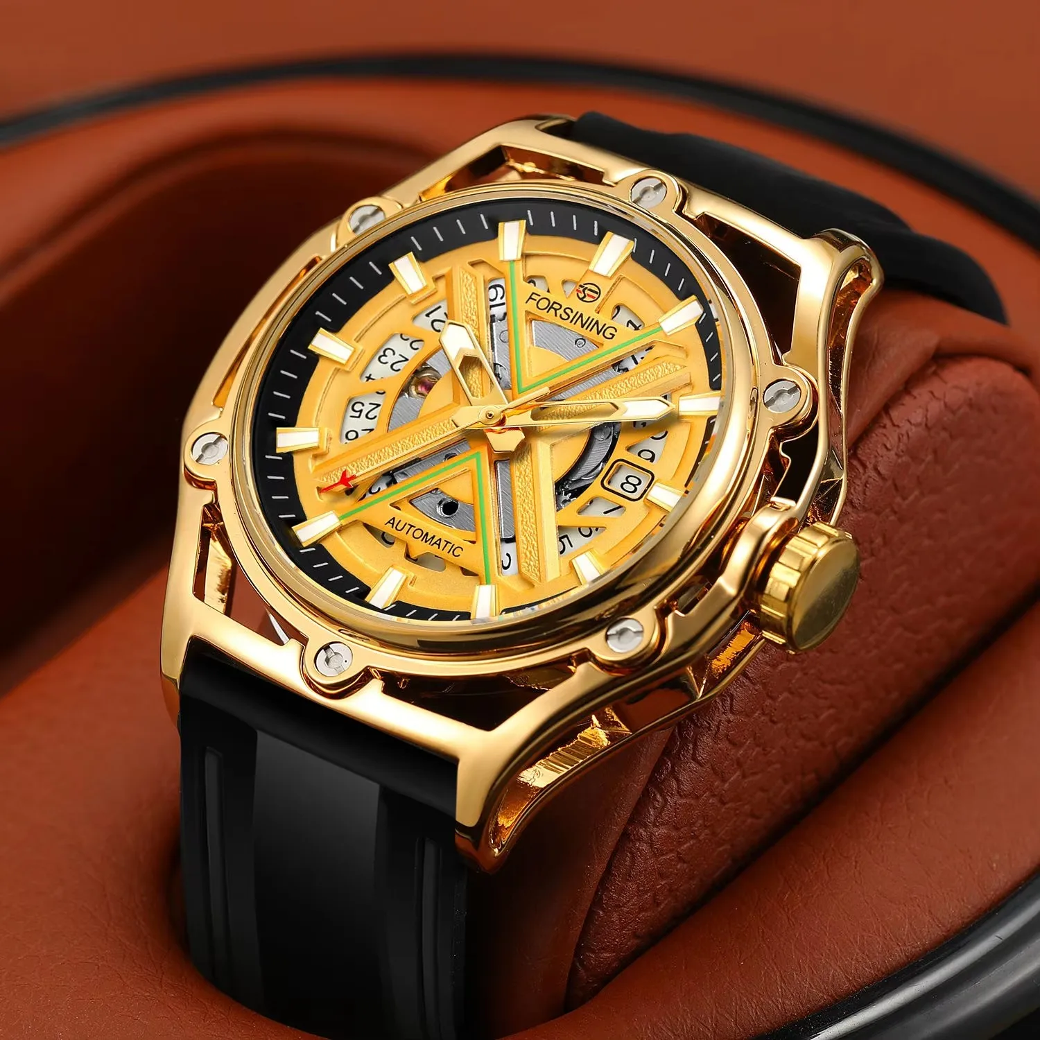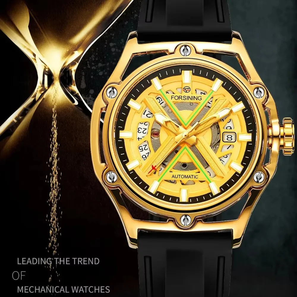 Forsining 8282 New Sports Gold Automatic Mens Watch Fashion Calendar Window Luminous Hands Rubber Luxury Mechanical Watches