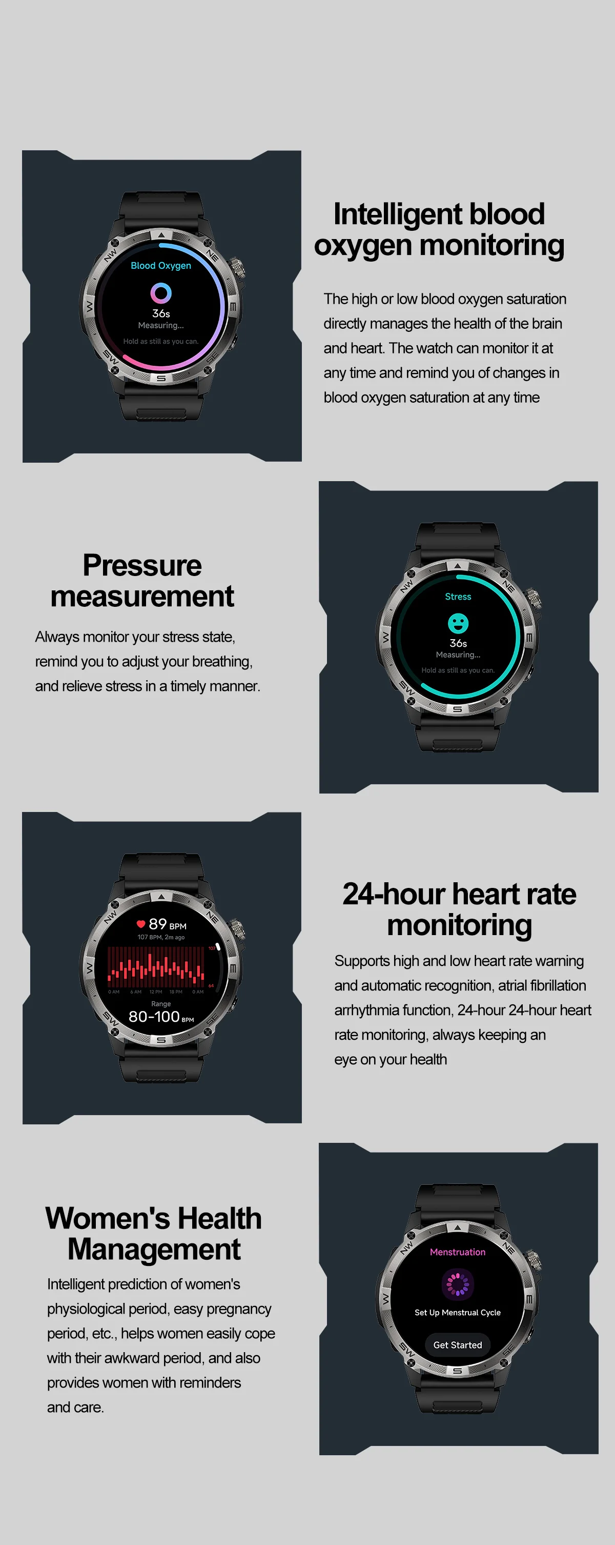 Sedentary reminder, water reminder, heart rate reminder, medication reminder, exercise reminder, pedometer, blood pressure, blood oxygen, heart rate, sleep, body temperature, blood glucose, respiration, weight, female assistant, etc. |