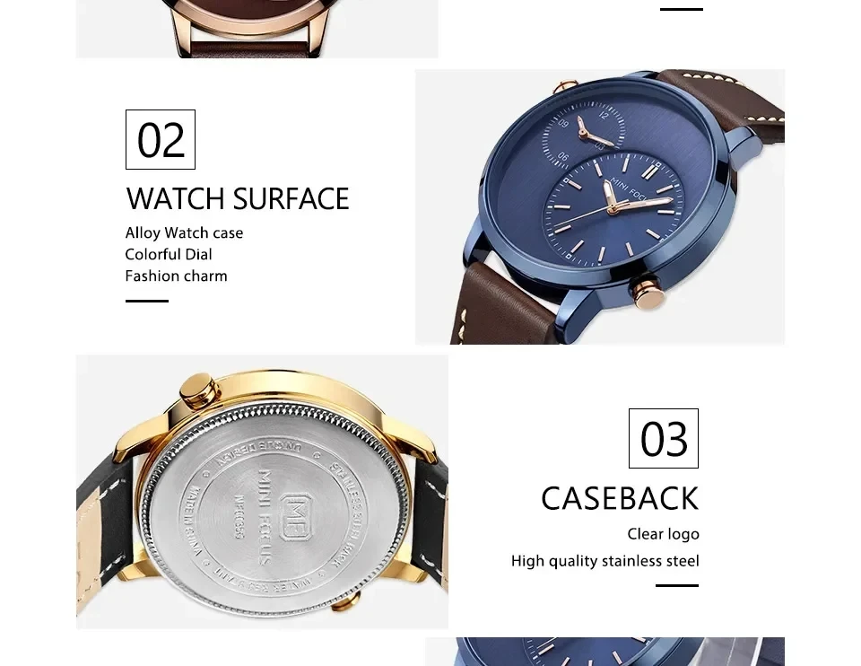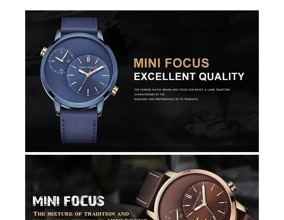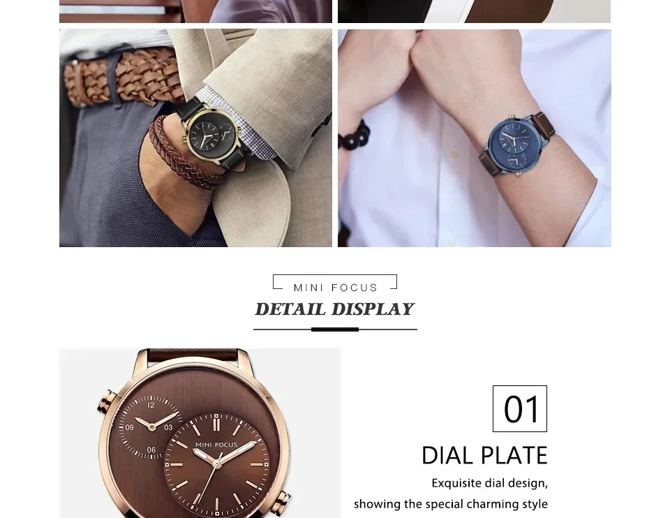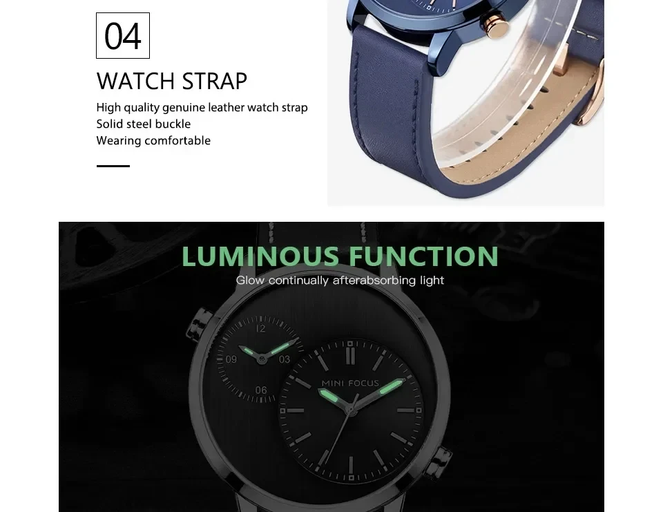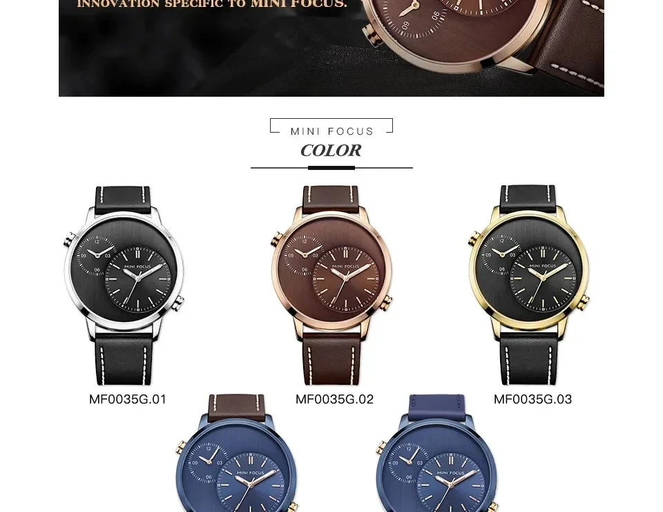 MINI FOCUS Fashion Genuine Leather Business 2 Time Zone Quartz-Watch Men Wristwatch Men Watches Fashion Casual Man Watch 0035G