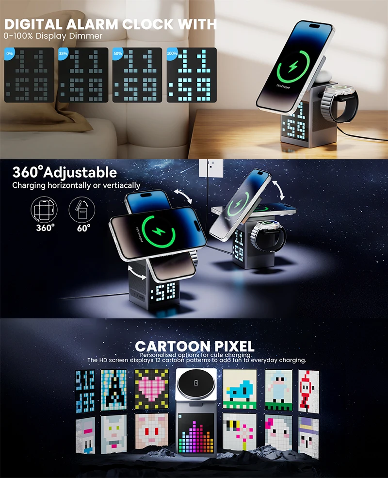 New 3 in 1 Magnetic Wireless Charging Station With Bluetooth Speaker Alarm Clock RGB Pixel Display Fast Charging for iPhone