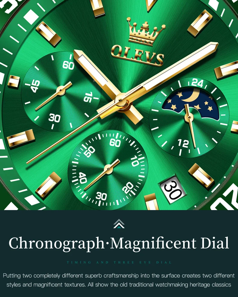 Feature: chronograph,Day/Date,Moon Phase,Waterproof,Luminous,Luminous Hands