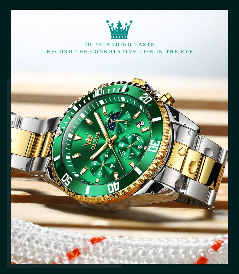 OLEVS 2870 Men's Watches Golden Stainless Steel Calendar Moon Phase Chronograph 42.5mm Big Dial Men's Wristwatches