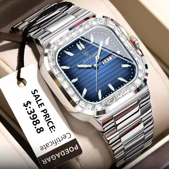 POEDAGAR Men Watch 975 Waterproof Luminous Date Sport Man Wristwatch Silver Blue Stainless Steel Diamond Quartz Men's Watches