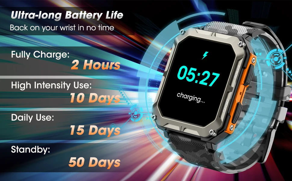 -Inside the thin and light smart watches, we have embedded a 380mAh battery, that fully charges for 2 hours, and supports 10 days of high-intensity use, 15 days of daily use, and 50 days of standby, so you can say goodbye to power anxiety.